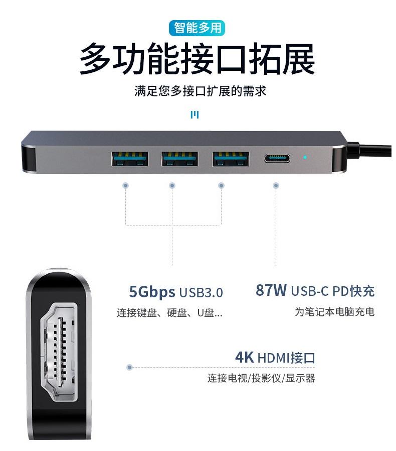5 IN 1 HUB ADATTATORE ALLUMINIO MODEL BYL-2008 TYPE-C TO (3 USB 3.0 / TYPE-C 87W / HDMI 4K) (CON IMBALLAGGIO)