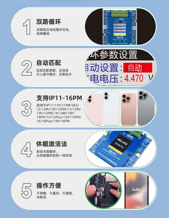 RELIFE TB-06 PRO COMPLETAMENTE AUTOMATICO CICLO DELLA BATTERIA TESTER RICARICA RAPIDA BATTERIA ATTIVATA RIPARAZIONE DEL CAVO DELLA BATTERIA PER IPHONE 11-16 SERIE